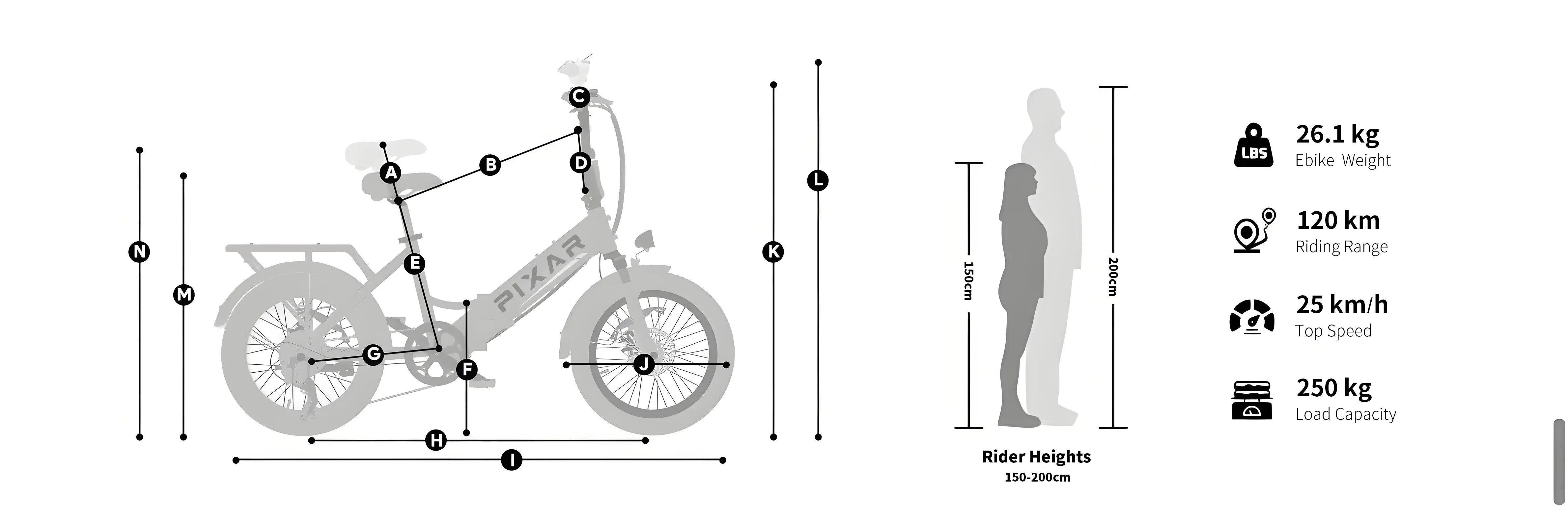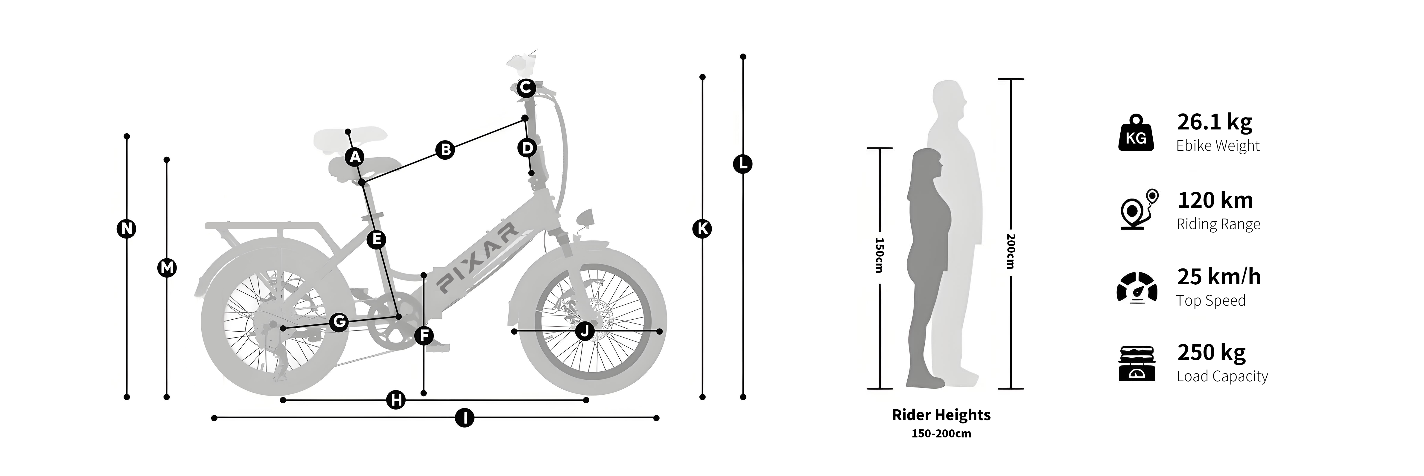 The recommended rider height for Rusher folding ebike is 150-200 (cm), max load 150 kg.